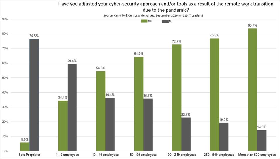 The overwhelming majority of enterprises have transformed their cybersecurity approach over the last six months, with 83% of large-scale enterprises leading all organizations. It's encouraging to see small and medium-sized businesses adjusting and improving their approach to cybersecurity. Reflecting how digitally-driven many small and medium businesses are, cybersecurity adjustments begin in organizations with 10 to 49 employees. 60% adjusted their cloud security postures as a result of distributed workforces.