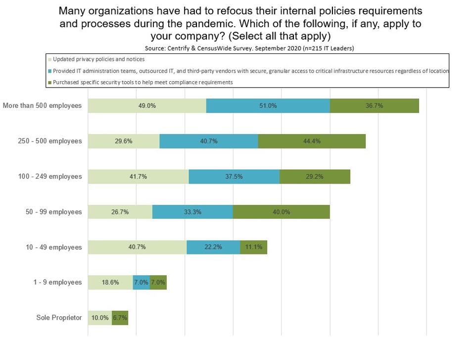These and many other insights are from a recent survey of IT leaders completed by CensusWide. The survey's objectives on understanding how the dynamics of IT investments, operations and spending have shifted over the last six months. The study finds that the larger the enterprise, the more important it is to secure remote access to critical infrastructure to IT admin teams. Remote access and updating privacy policies and notices are two of the highest priorities for mid-size organizations to enterprises today. The methodology is based on interviews with 215 IT leaders located in the U.S.